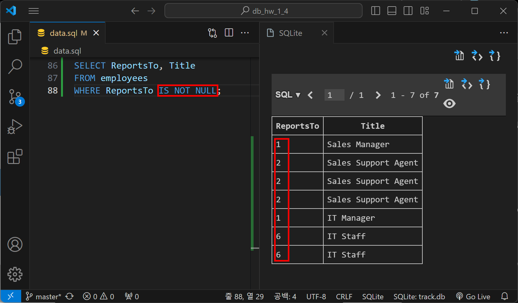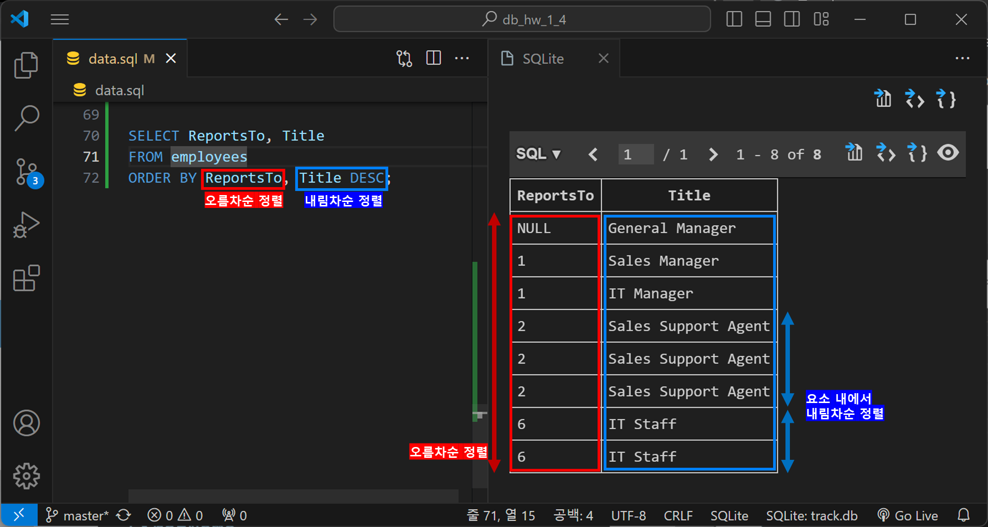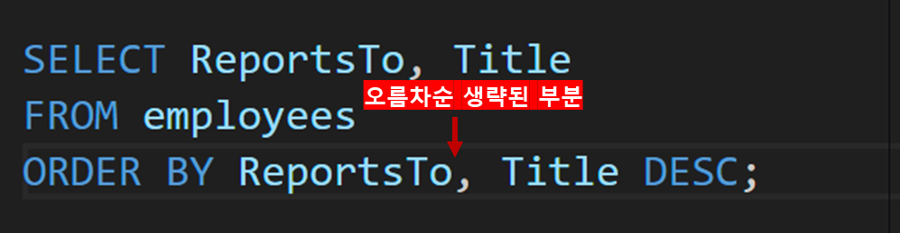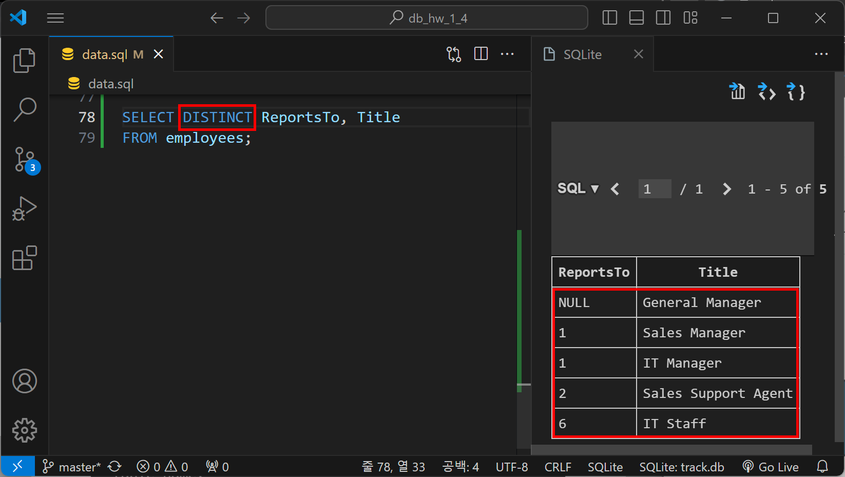 여기서 조심해야 할 부분은 DISTINCT 가 각각 요소에 적용되는 것(OR)이 아니라 (AND)가 적용된다는 점이다. 예를들어 오른쪽 출력값을 확인해보면, 중복을 제거하는 DISTINCT ReportsTo가 적용 되었는데 1에 해당하는 값이 두개 출력되어있는 것을 확인 할 수 있다. 이를 토대로 다수로 중복을 제거하는 경우가 생기면, ReportsTo 와 Title이 모두 중복되어야 제거를 한다는 점을 유추할 수 있다.