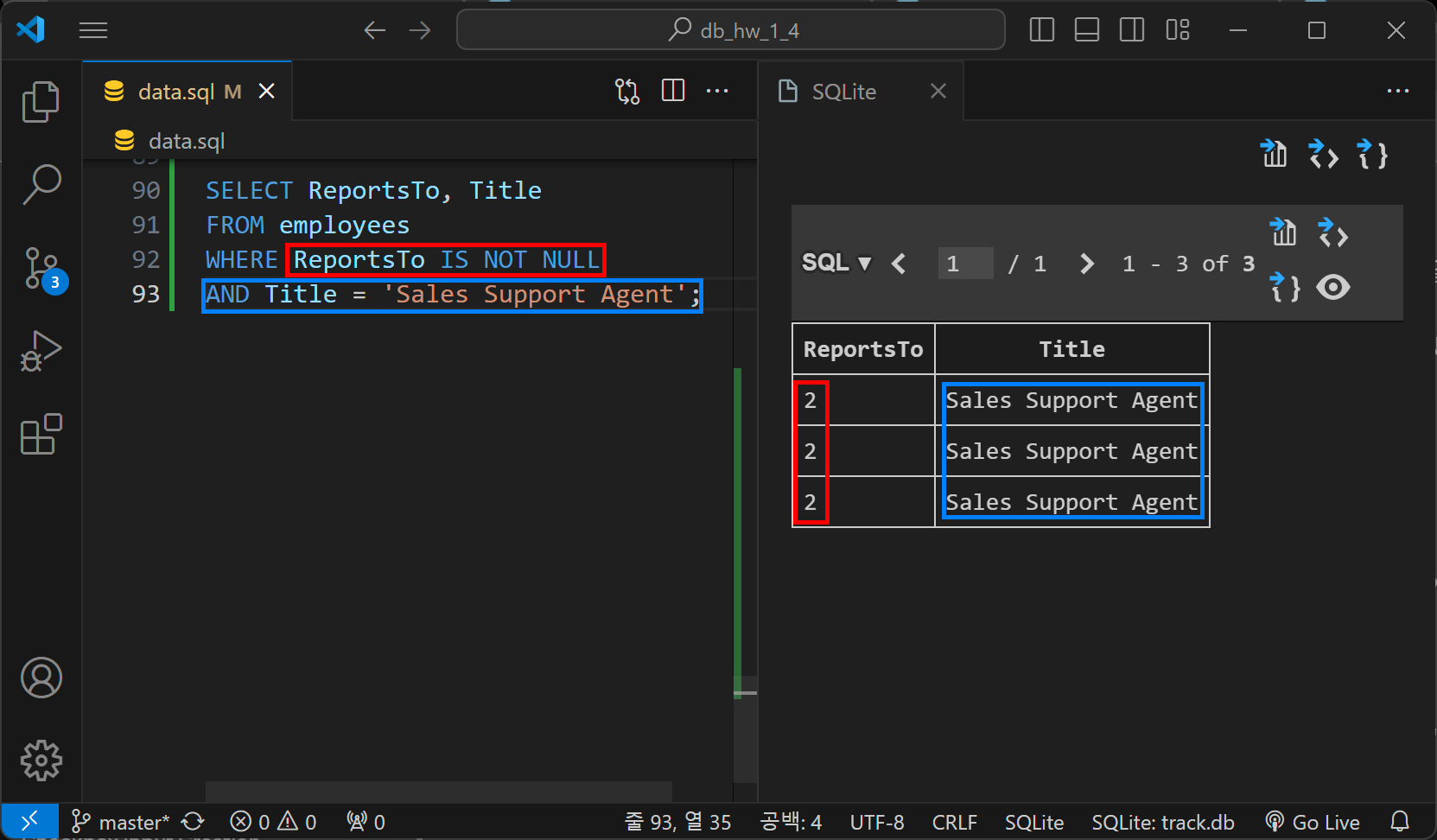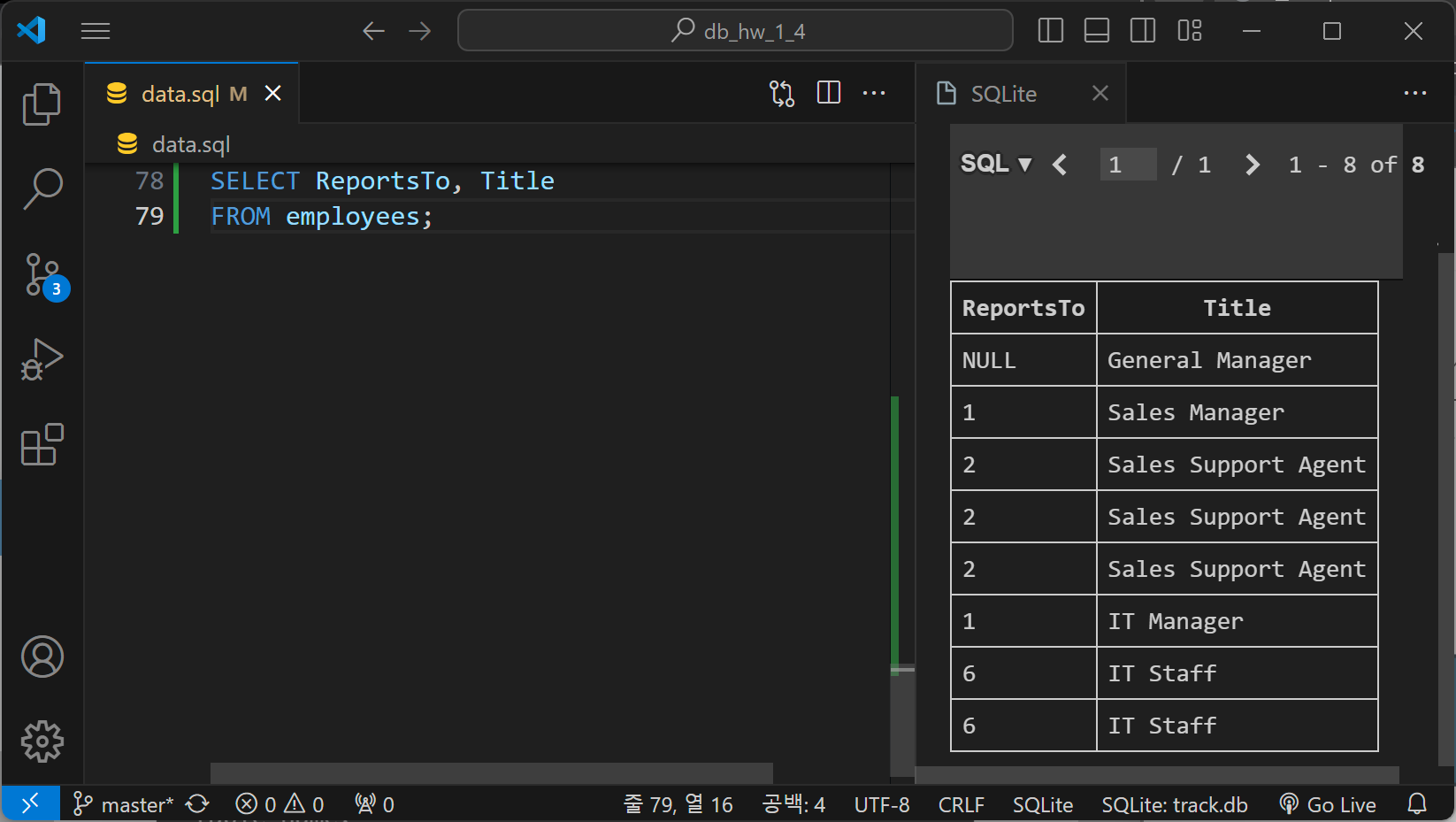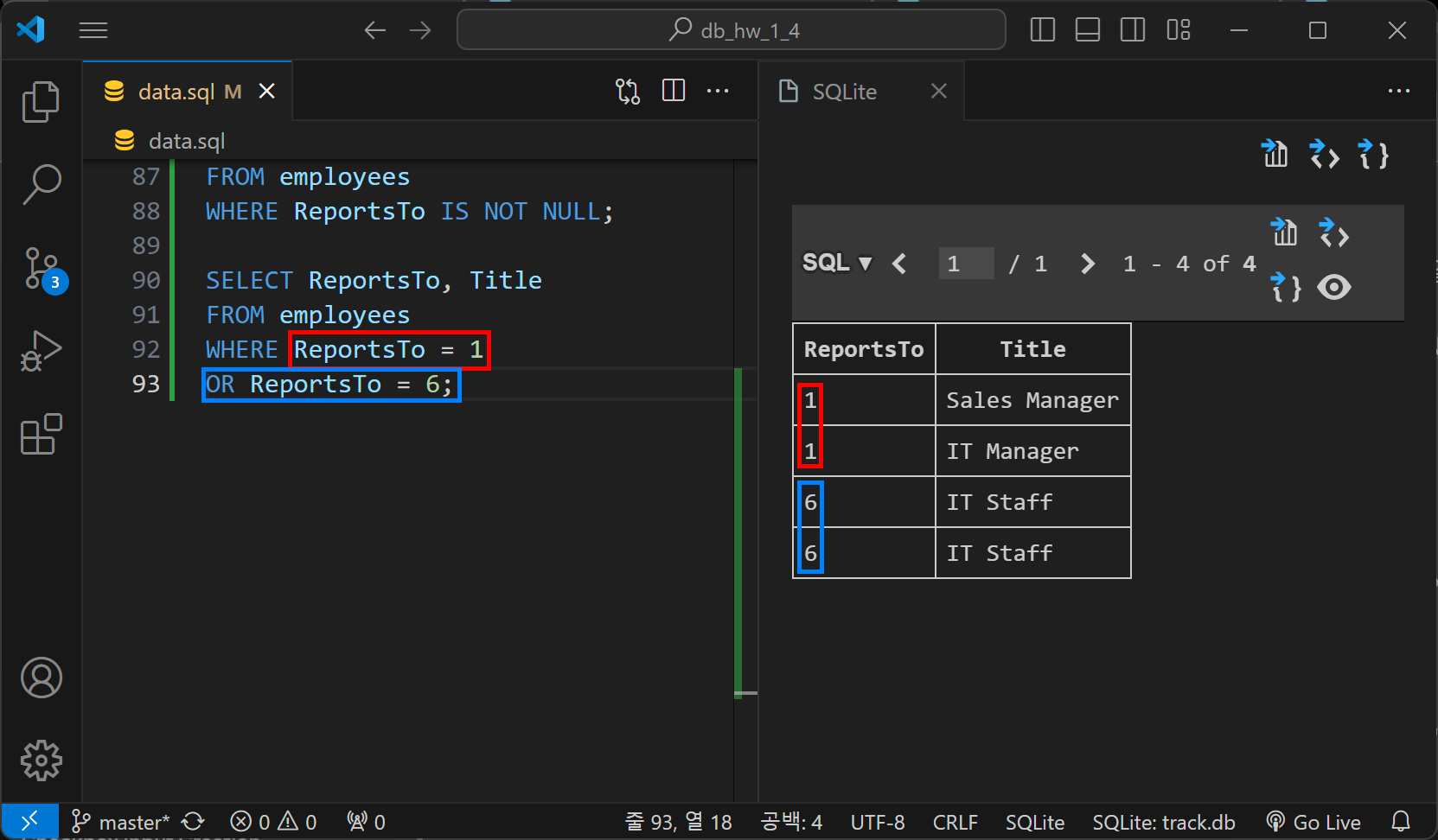 여기서 조심해야 할 부분은 DISTINCT 가 각각 요소에 적용되는 것(OR)이 아니라 (AND)가 적용된다는 점이다. 예를들어 오른쪽 출력값을 확인해보면, 중복을 제거하는 DISTINCT ReportsTo가 적용 되었는데 1에 해당하는 값이 두개 출력되어있는 것을 확인 할 수 있다. 이를 토대로 다수로 중복을 제거하는 경우가 생기면, ReportsTo 와 Title이 모두 중복되어야 제거를 한다는 점을 유추할 수 있다.
