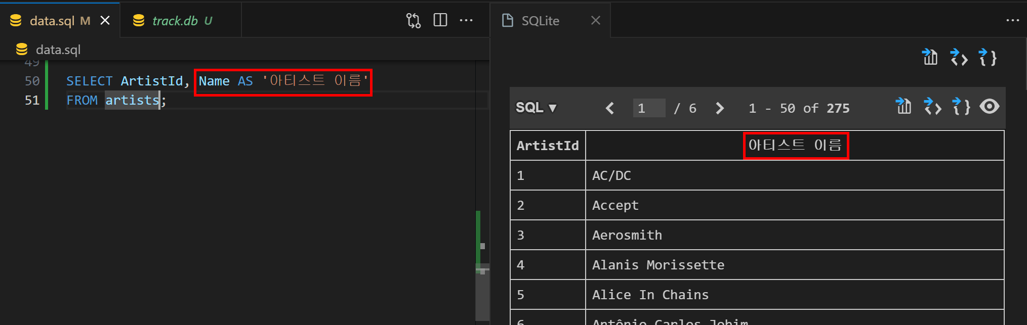 그러면 우리는 데이터를 불러들어올 때 해당 필드명으로만 해야할까? 아니다. AS + '(변경할 이름)' 를 통해임시로 바꿔줄 수 있다. 은근히 as도 여기저기 많이 쓰이는 문법인 것 같다. django할때도 as_p 등등 사용했었는데..