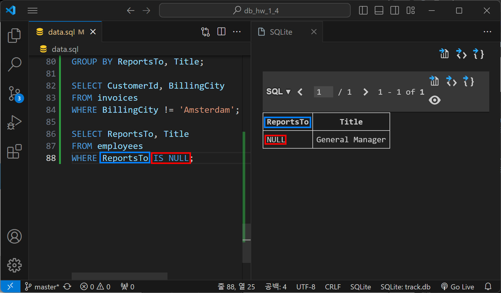 이전 예시에서 NULL 값을 본적이 있다. 오름차순을 진행했을 때, 가장 위에 출력되는 것을 확인 할 수 있었는데, 이번에는 해당 값을 조회하는 방법이다.