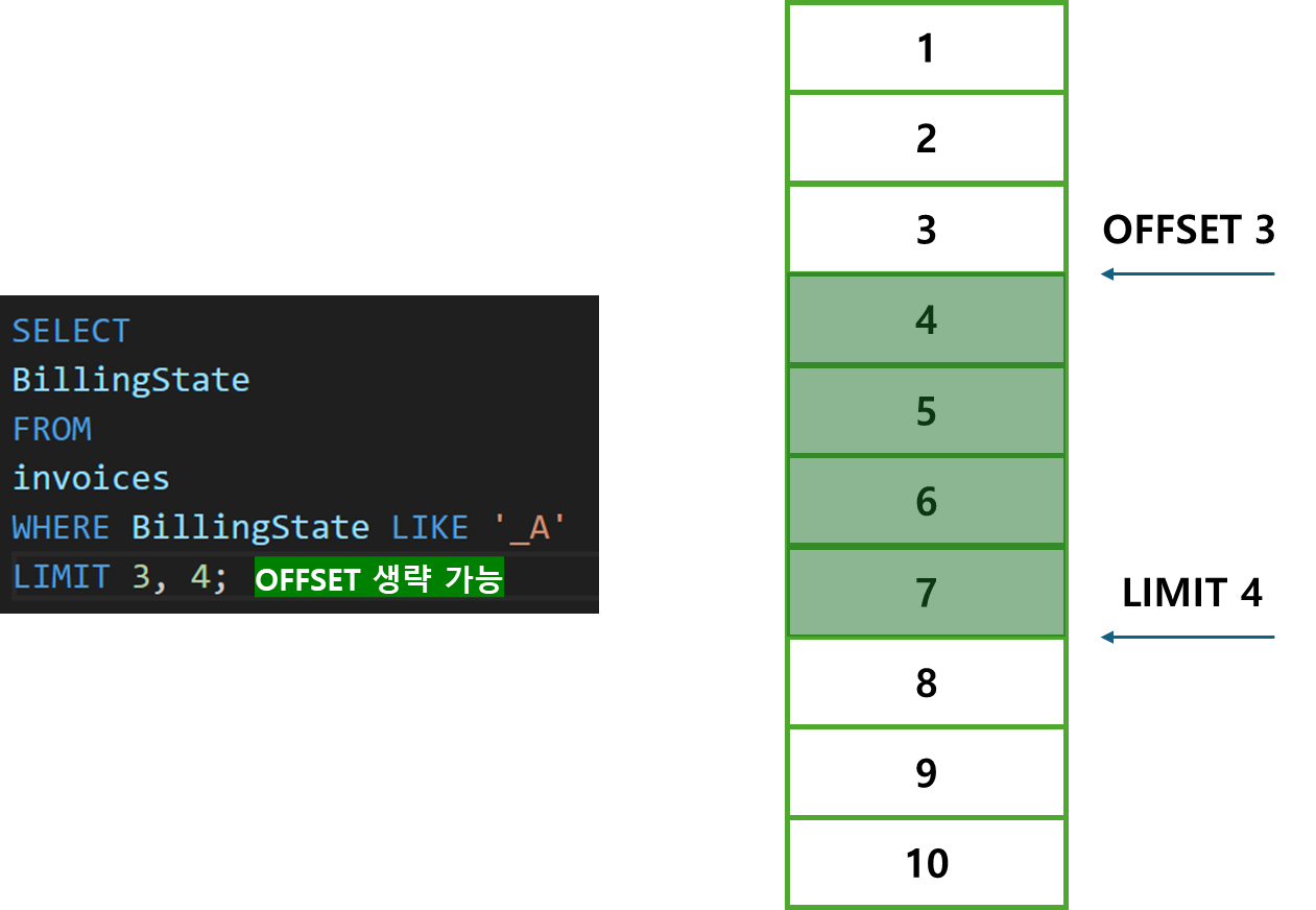 모든 데이터를 조회할 필요 없이 일부 개수만 가져올 수 있다. 예를들어 조회하는 데이터가 100개라면 LIMIT을 통해 출력을 10개, 20개 .. 만 출력할 수 있다. 또, 10개를 가져오되 중간부터 시작해서 10개를 조회할 것이라면 OFFSET 을 통해 일부 정보를 뛰어넘어서 출력할 수 있다.