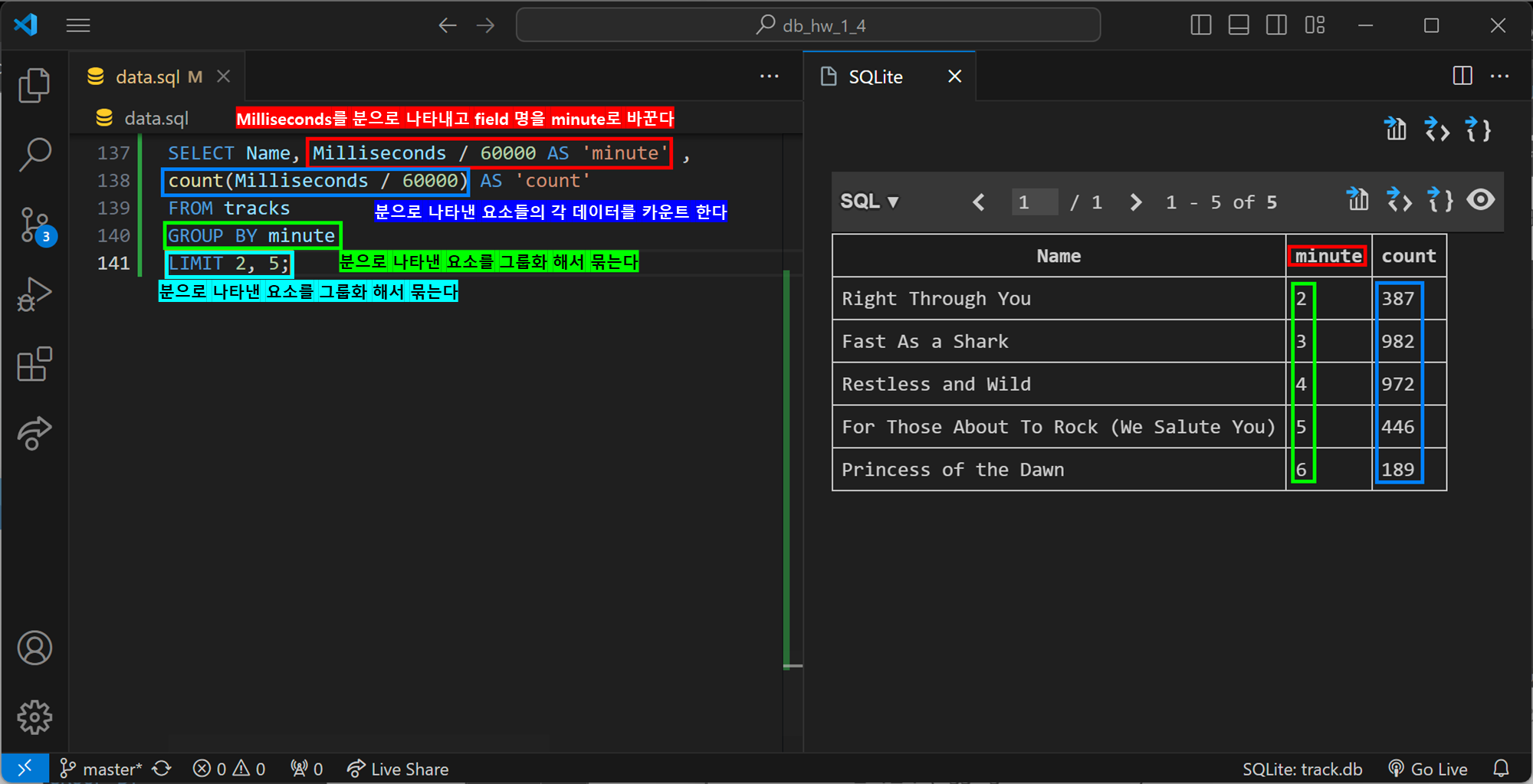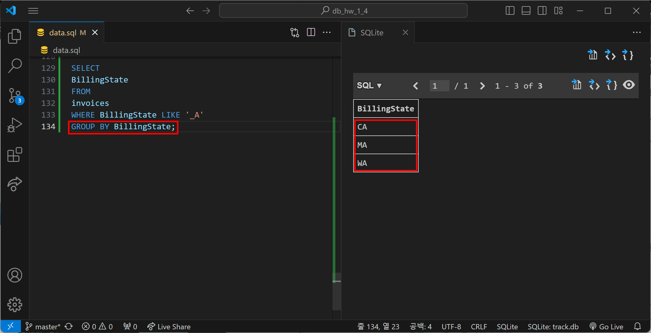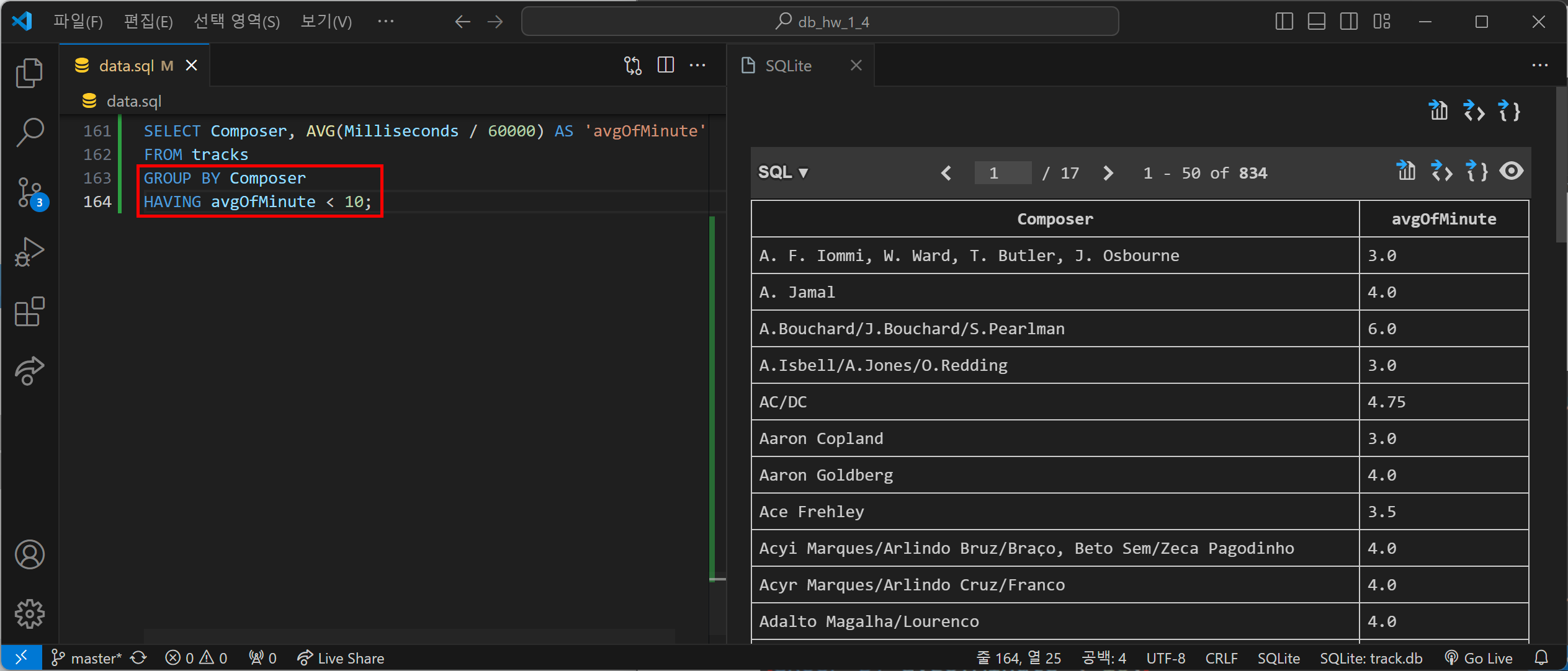 일단 SQLite에서는 해당 조건을 만족하는 데이터들을 그룹화 하려면 어떻게 해야할까? 이 때, HAVING을 사용하여 필터링할 수 있다.