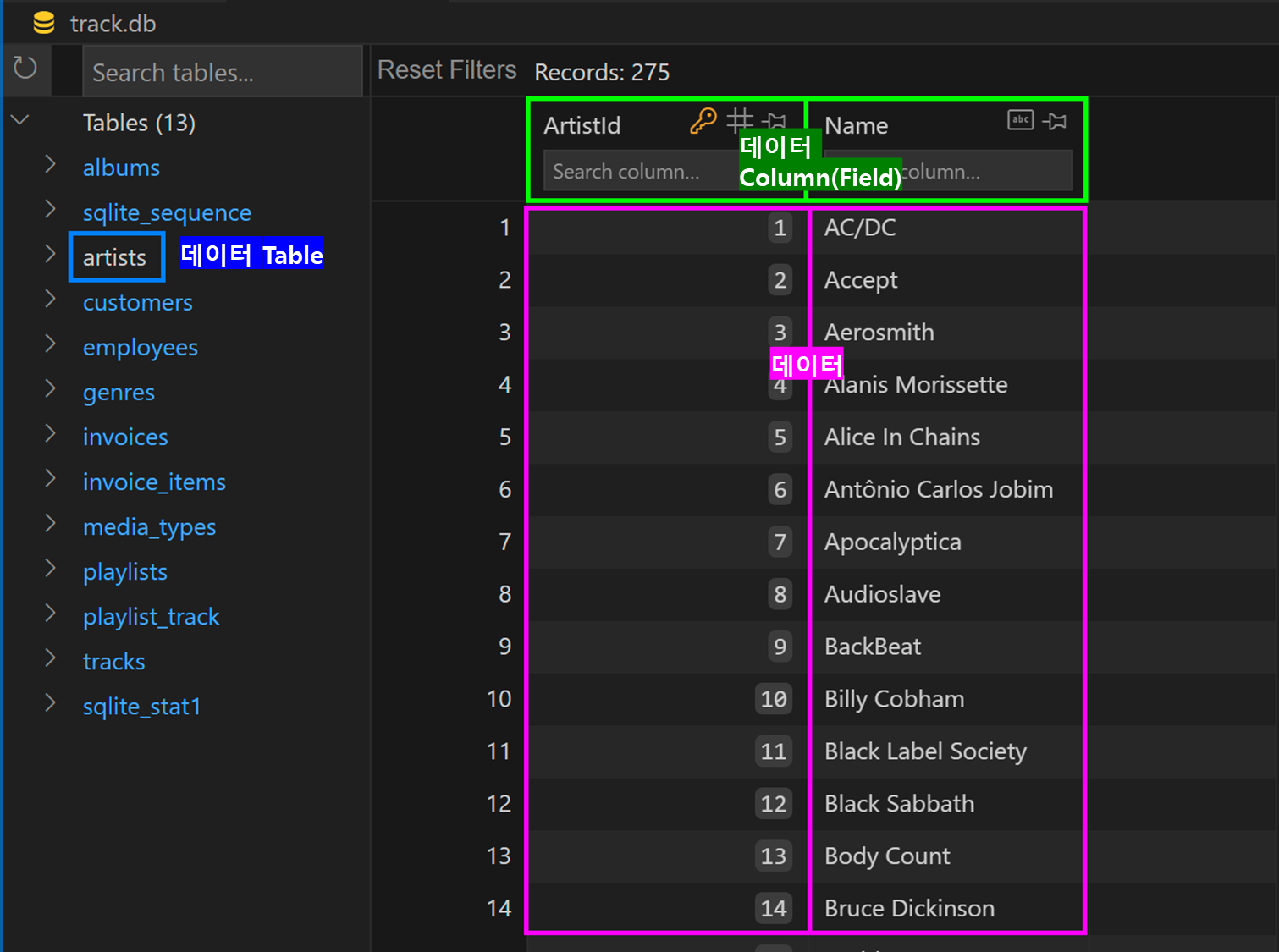 탐색할 때 연결만 해두면 되는 것이고, 탐색은 table명으로 지정한다. 이후 SELECT로 column(field)를 지정하여 데이터를 가져온다.