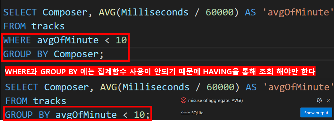 쓰고보니 극단적인 예시라 AVG를 써서 데이터 조회,출력 의미가 애매하긴한데, GROUP BY와 WHERE에는 사용이 불가하고 HAVING에서는 가능하다는 점이 중요하다.