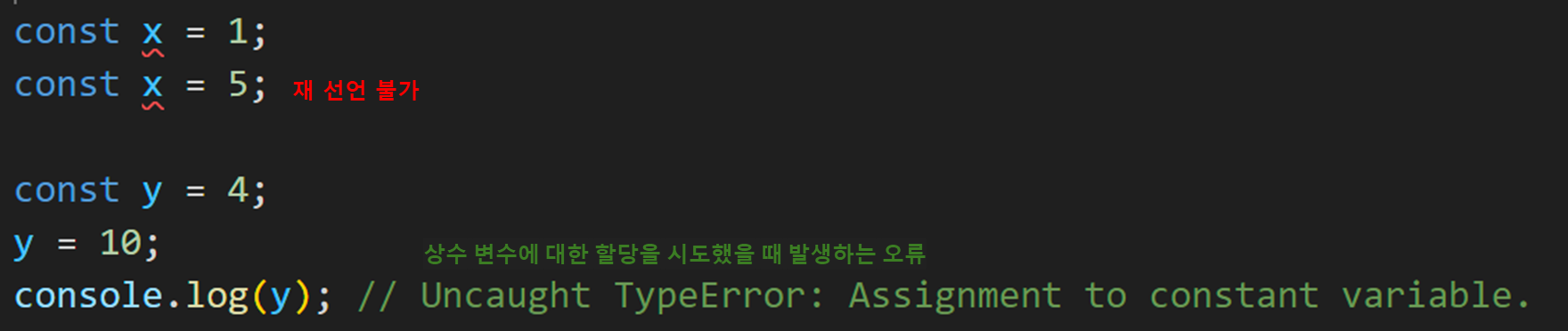 - 블록 스코프(block scope)를 갖는 지역 변수를 선언 - 재할당 불가능 - 재선언 불가능 - ES6에서 추가 |