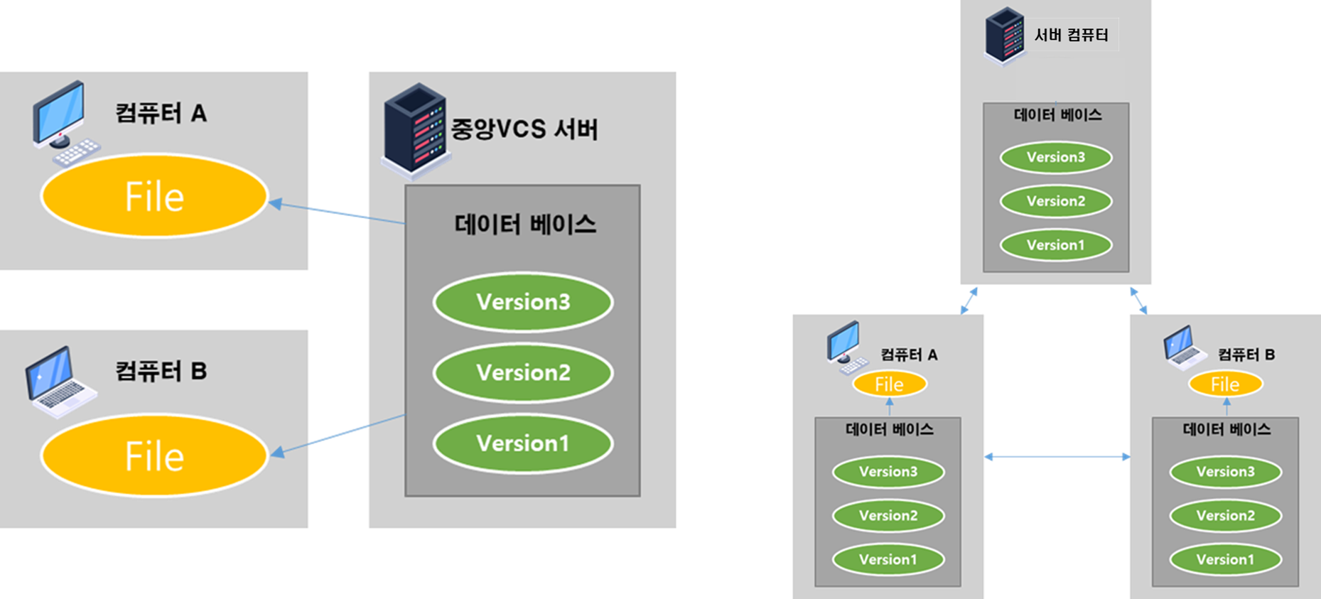 버전 관리 시스템에는 중앙, 분산으로 2가지 종류가 있다.