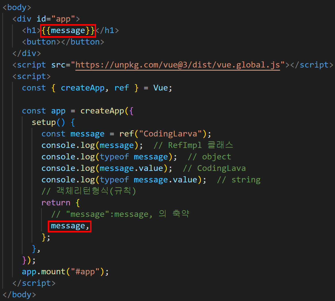 - 출력 시 ref()로 감싸진 데이터는 자동으로 언래핑을 통해 내부 데이터를 참조한다.