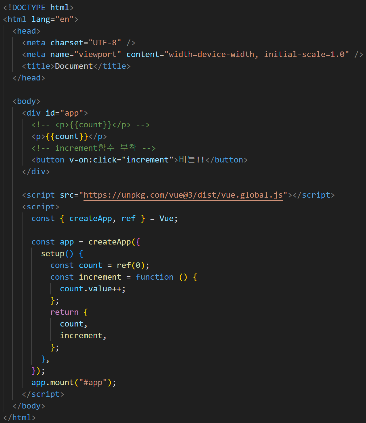 우리는 CDN 방식이 편하기 때문에 공식 홈페이지를 참고하여 코드를 작성할 예정이다. 혹시나 유의해야 할 점은 Vue3 버전인 것을 잊지말자. 간혹가다 Vue2 페이지에서 헤매는 경우도 있다.