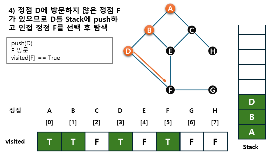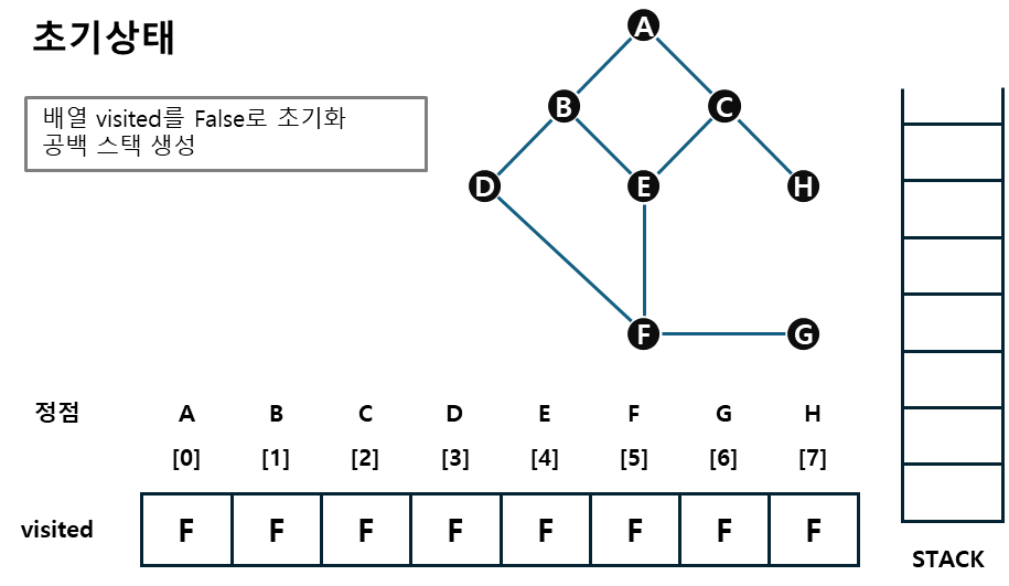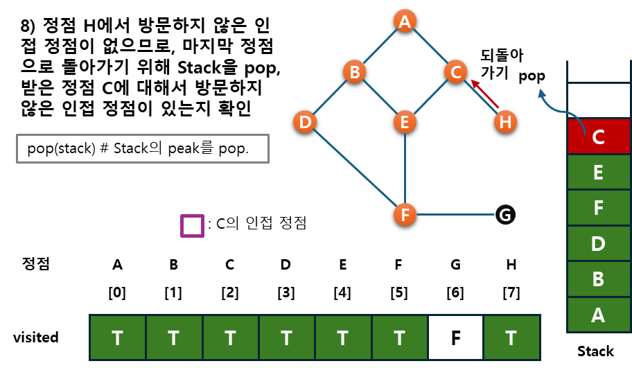 - 후퇴단계 : 방문하지 않은 정점이 없으면, 탐색의 방향을 바꾸기 위해서 스택을 제거(pop)하여 받은 가장 마지막 방문 정점 v로 하여 다시 2)를 반복한다.