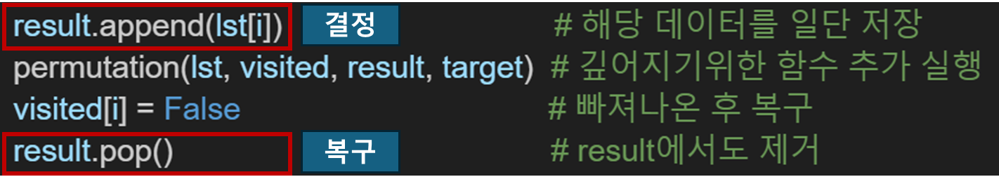 - 이 함수는 입력 리스트 lst , 방문 체크 리스트 visited , 결과를 저장할 리스트 result , 만족하는 조건 target 을 매개변수로 넣어준다