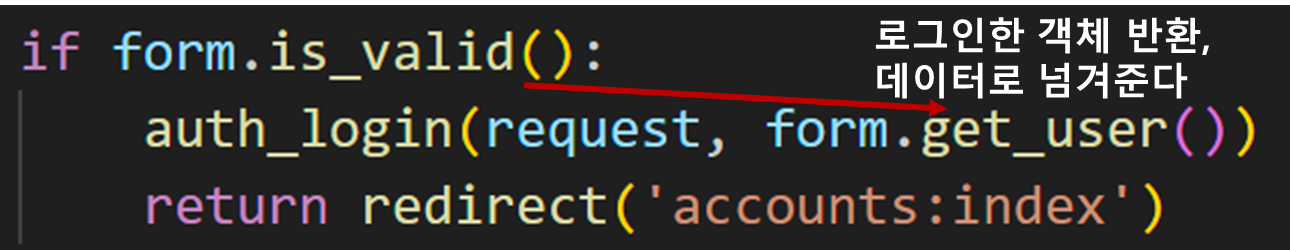 get_user() : AuthenticationForm의 인스턴스 메서드로 유효성 검사를 통과했을 경우 로그인 한 사용자 객체를 반환한다