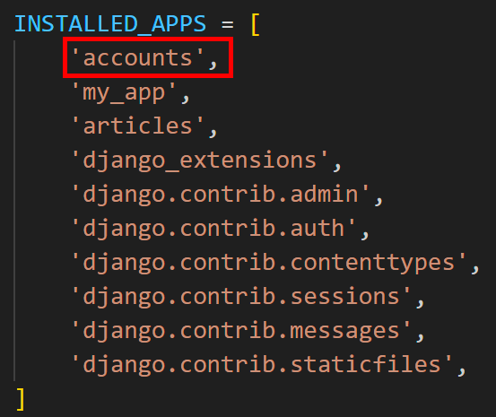 - : 위의 사진에서 INSTALLED_APPS를 살펴보면 django.contrib.auth로 내장된 auth 앱을 확인할 수 있다